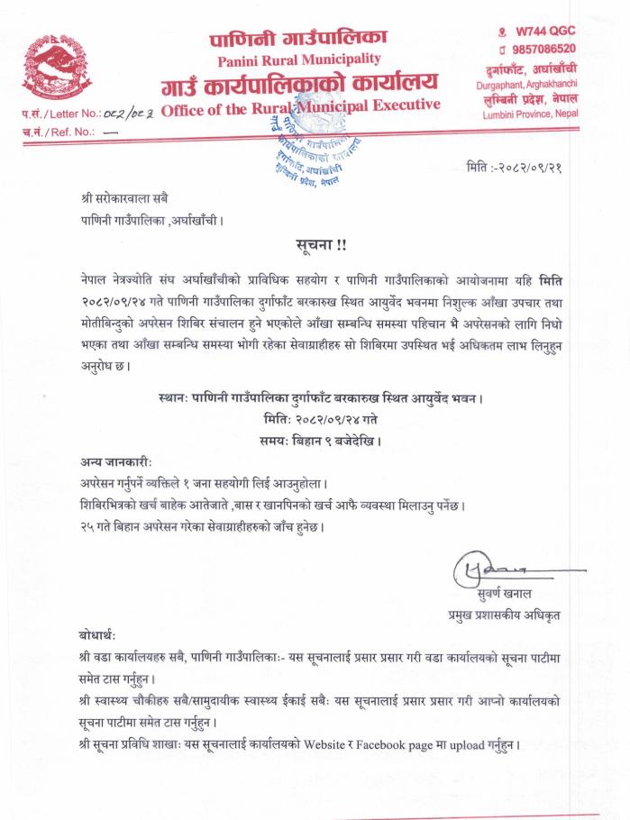 निशुल्क आखा उपचार तथा मोतिबिन्दुको अपरेसन शिविर सन्चालन हुने सम्बन्धी सूचना ।