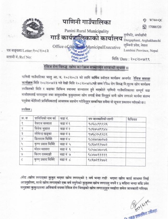 रेविज रोग विरुद्धको खोप कार्यक्रम सञ्चालन सम्बन्धी सूचना ।