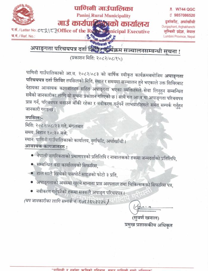 अपाङ्गता परिचयपत्र दर्ता शिविर कार्यक्रम सञ्चालन सम्बन्धी सूचना ।।