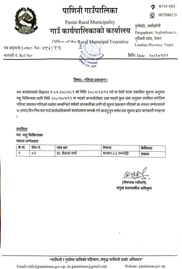 पशु चिकित्सक पदको अन्तिम नतिजा प्रकशन सूचना।।