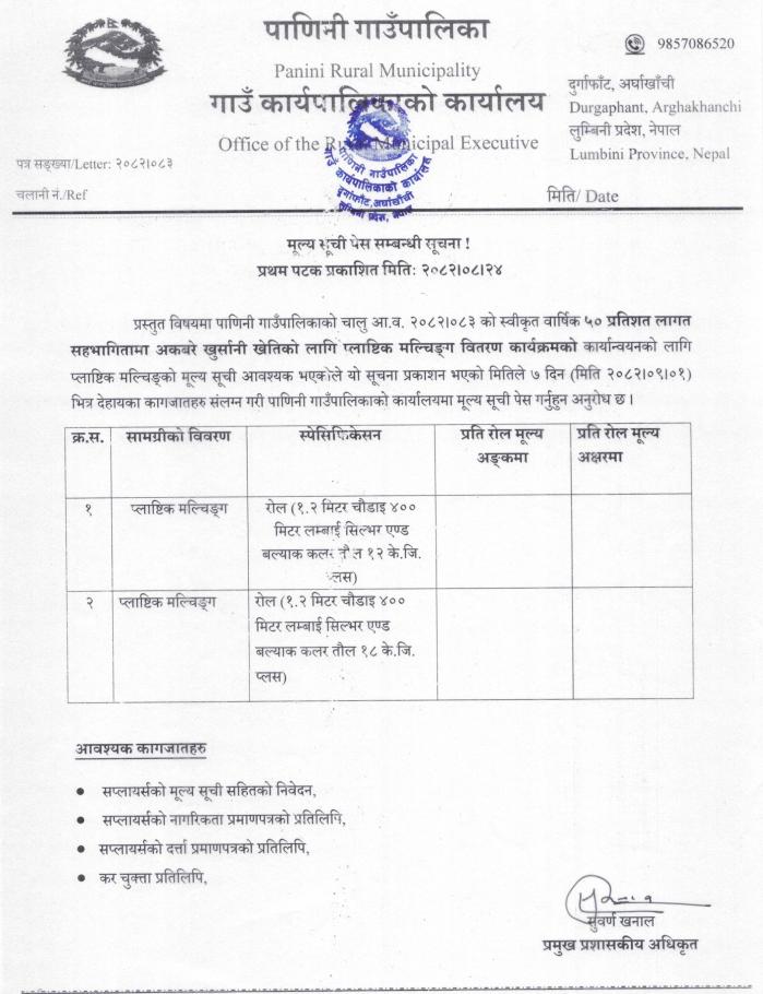 मूल्यसूची पेस सम्बन्धी सूचना ।