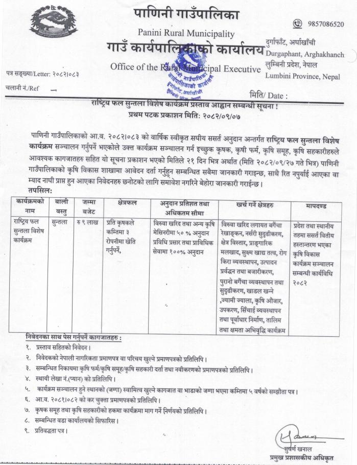 राष्ट्रिय फल सुन्तला विशेष कार्यक्रम प्रस्ताव आव्हान सम्बन्धी सूचना ।