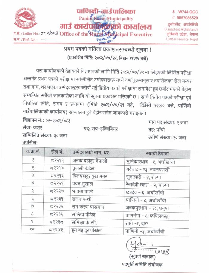 सब- ईन्जिनियरको प्रथम पत्रको नतिजा प्रकाशन सम्बन्धी सूचना ।