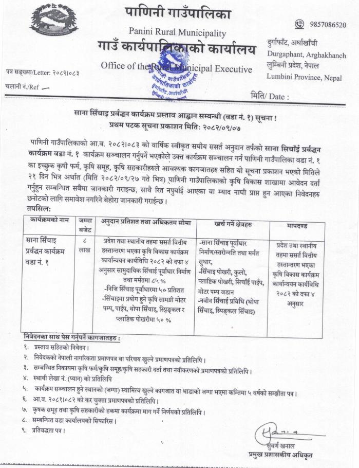 साना सिँचाई प्रवर्द्धन कार्यक्रम प्रस्ताव आव्हान सम्बन्धी सूचना ।