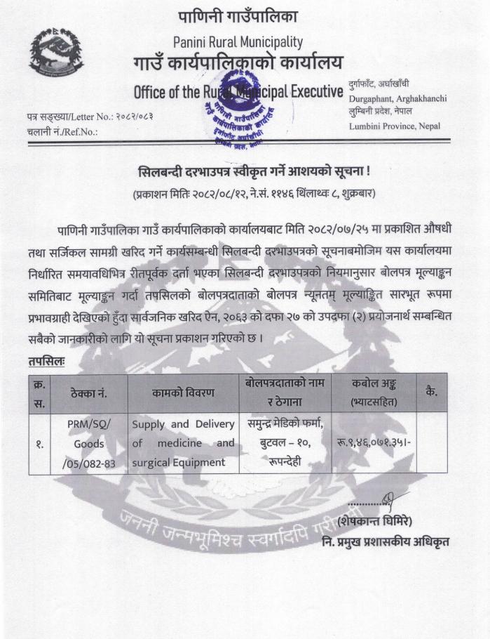 सिलबन्दी दरभाउपत्र स्वीकृत गर्ने आशयको सूचना ।