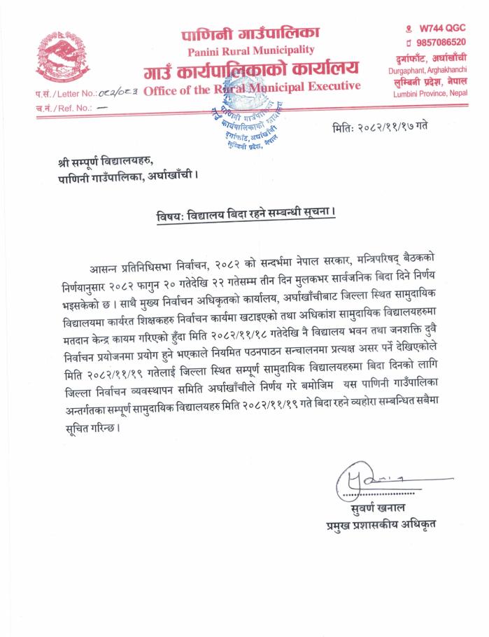 विद्यालय बिदा रहने सम्बन्धी सूचना ।